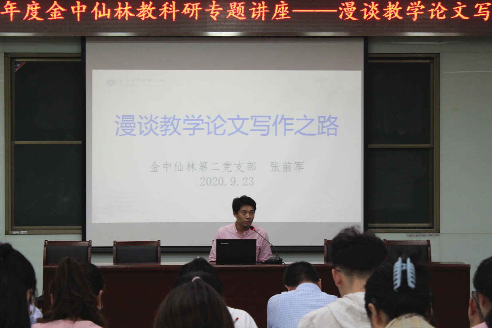 为充分发挥党员名师引领示范作用,展示党员教师风采,努力提高全校教师教科研水平,2020年9月23日,南京市金陵中学仙林分校中学部开展教科研活动,我校第二党支部书记张前军通知给老师们作了题为《漫谈教学论文写作之路》专题讲座。