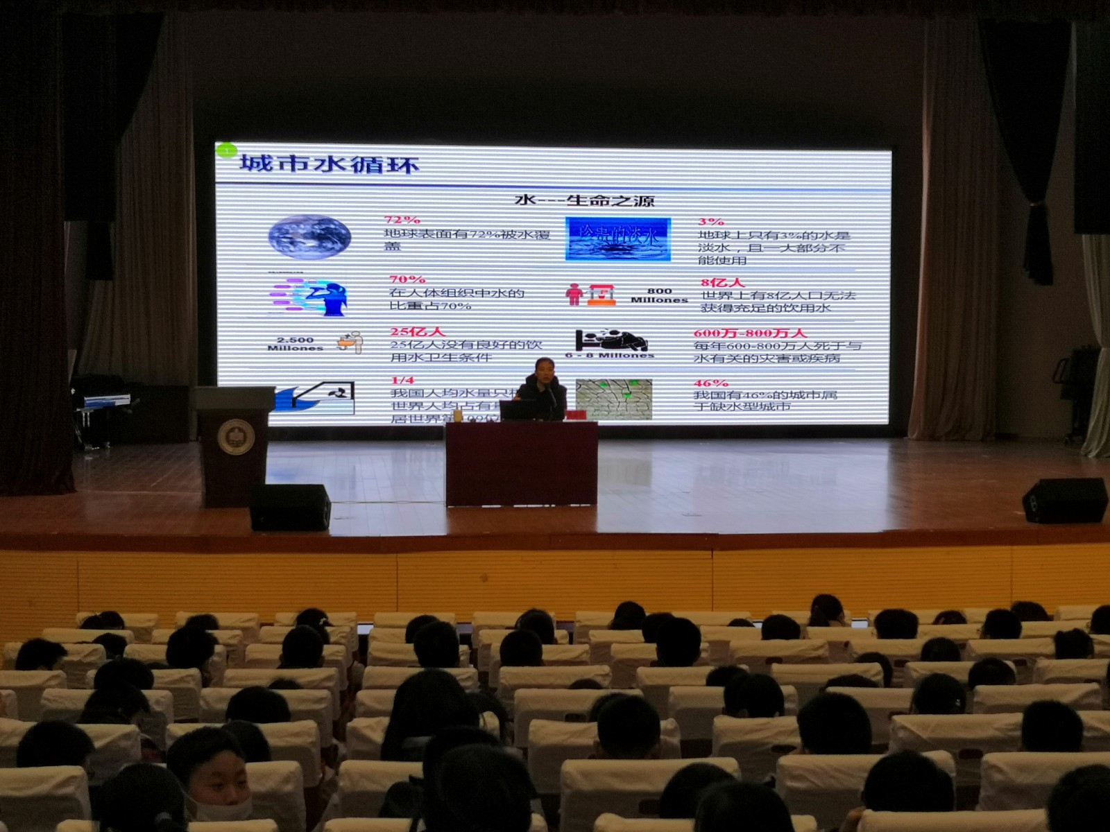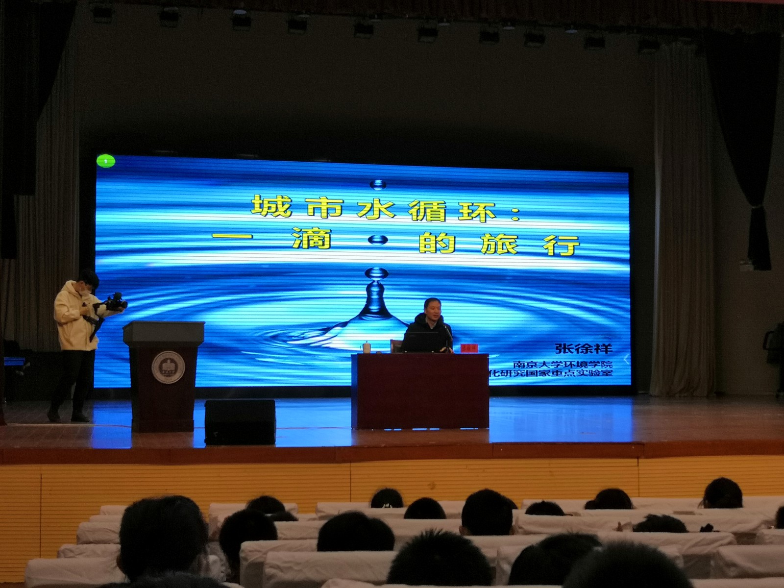 下面一步,南京大学环境学院张徐祥教授以“城市的水循环—一滴水的旅行”为主题,为同学们做讲座。他从城市水循环、城市化与水生态环境,污水处理等角度展开讲解。针对中国城市水环境的主要问题,他因地制宜地提出治理目标,结合南京城内的排污状况,给同学们带来具体形象地解释。他表示,未来的城市水系统,应该是建立在一种全新的概念之上,希望同学们能努力学习,这样的目标由大家来共同实现。