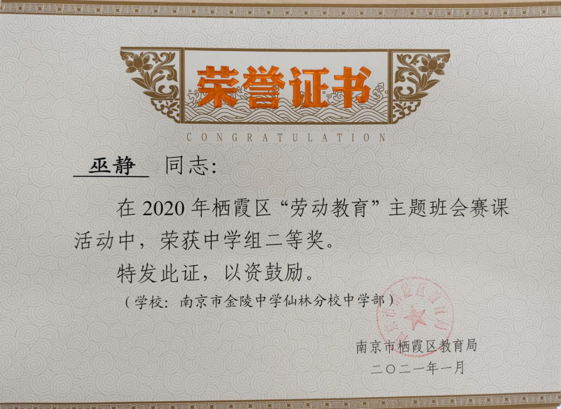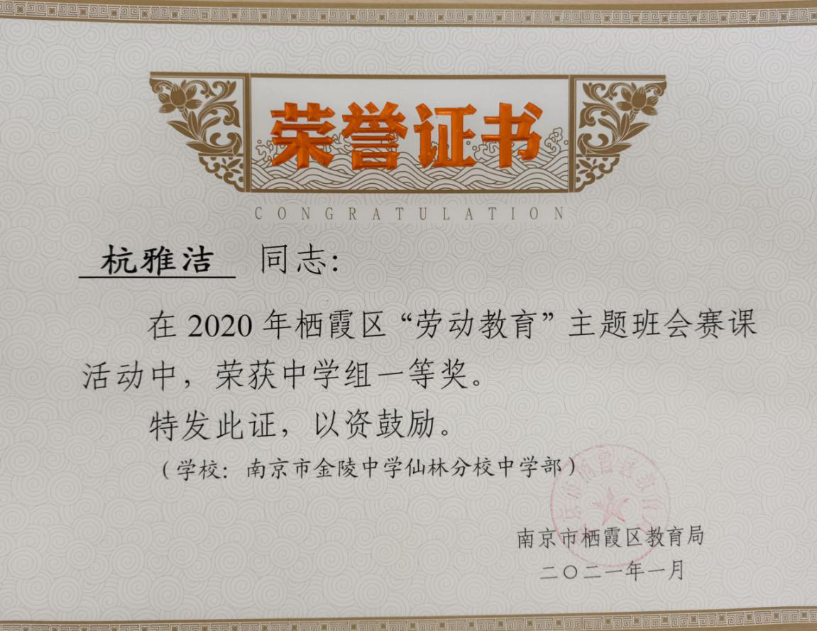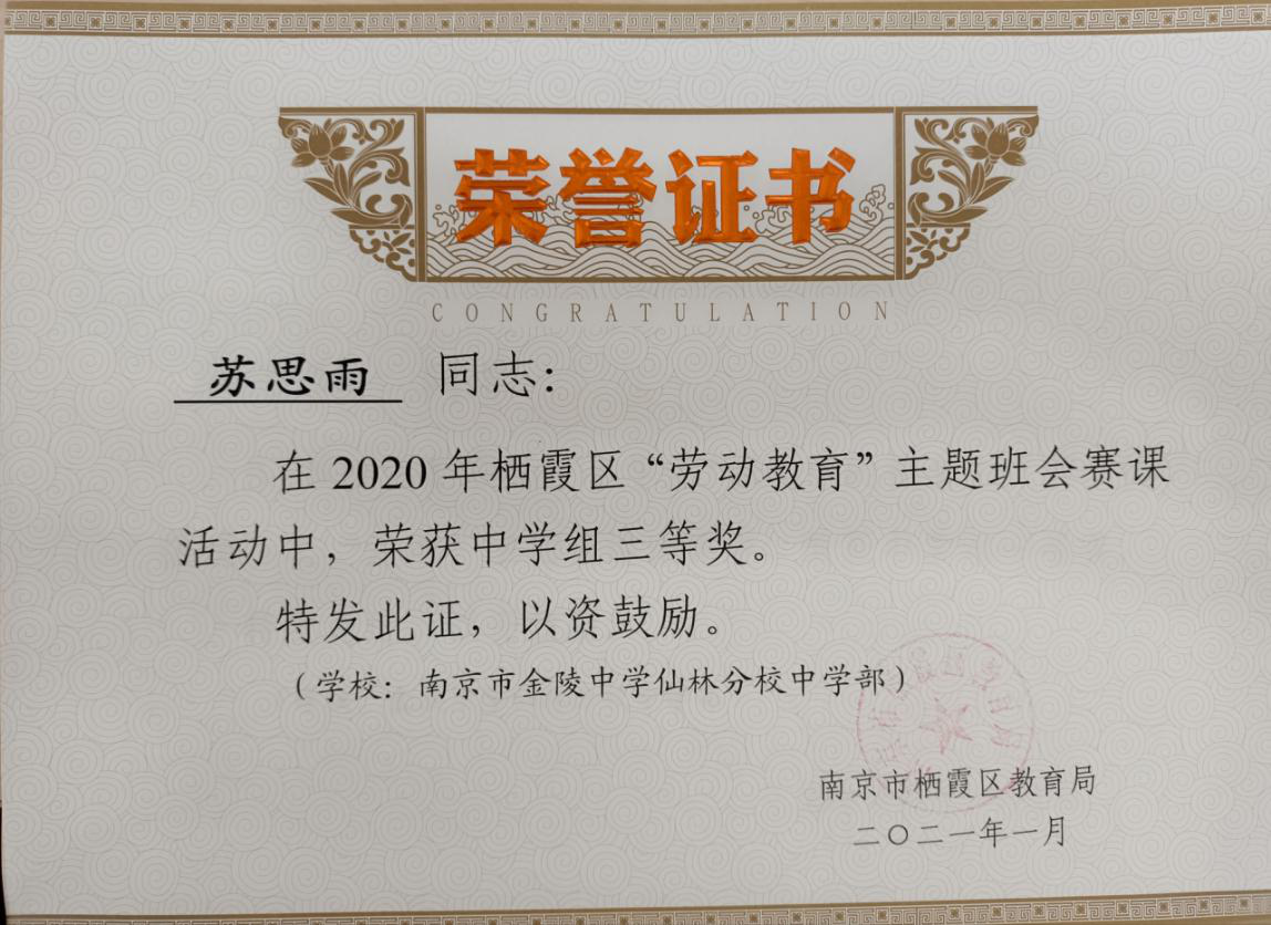 在2020年栖霞区“劳动教育”主题班会赛课活动中,我校班主任们积极参与,收获佳绩。杭雅洁、巫静、苏思雨老师分别荣获中学组一、二、三等奖。