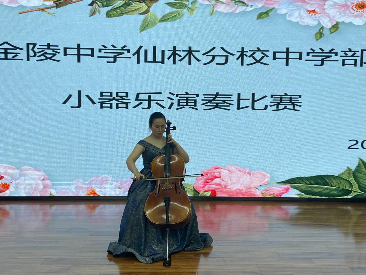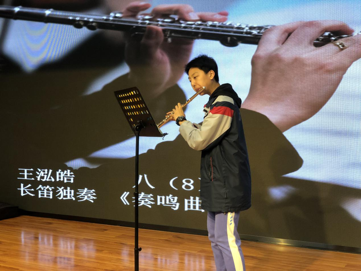 本届比赛由学校教学处和音乐组共同组织,学生先自主报名,再进行现场比赛。比赛中涉及的乐器种类丰富,包括二胡、古筝、竹笛、中阮、吉他、大提琴、小提琴、长笛等。你看!选手们个个妆容精致、淡定自如,如同音乐的精灵,为大家带来了视觉与听觉的盛宴。你听!张子晋、李正羿、杨思瀚等同学的竹笛声清脆明亮、热烈欢快,七年级的小观众们沉浸其中,感受着音乐带来的喜悦;刘星辰等同学演奏的古筝曲时而舒缓、时而急促,表演自如、技巧娴熟……一曲曲悠扬动听的旋律似溪水流淌,似微风轻拂,陶醉了在场的每一位听众。