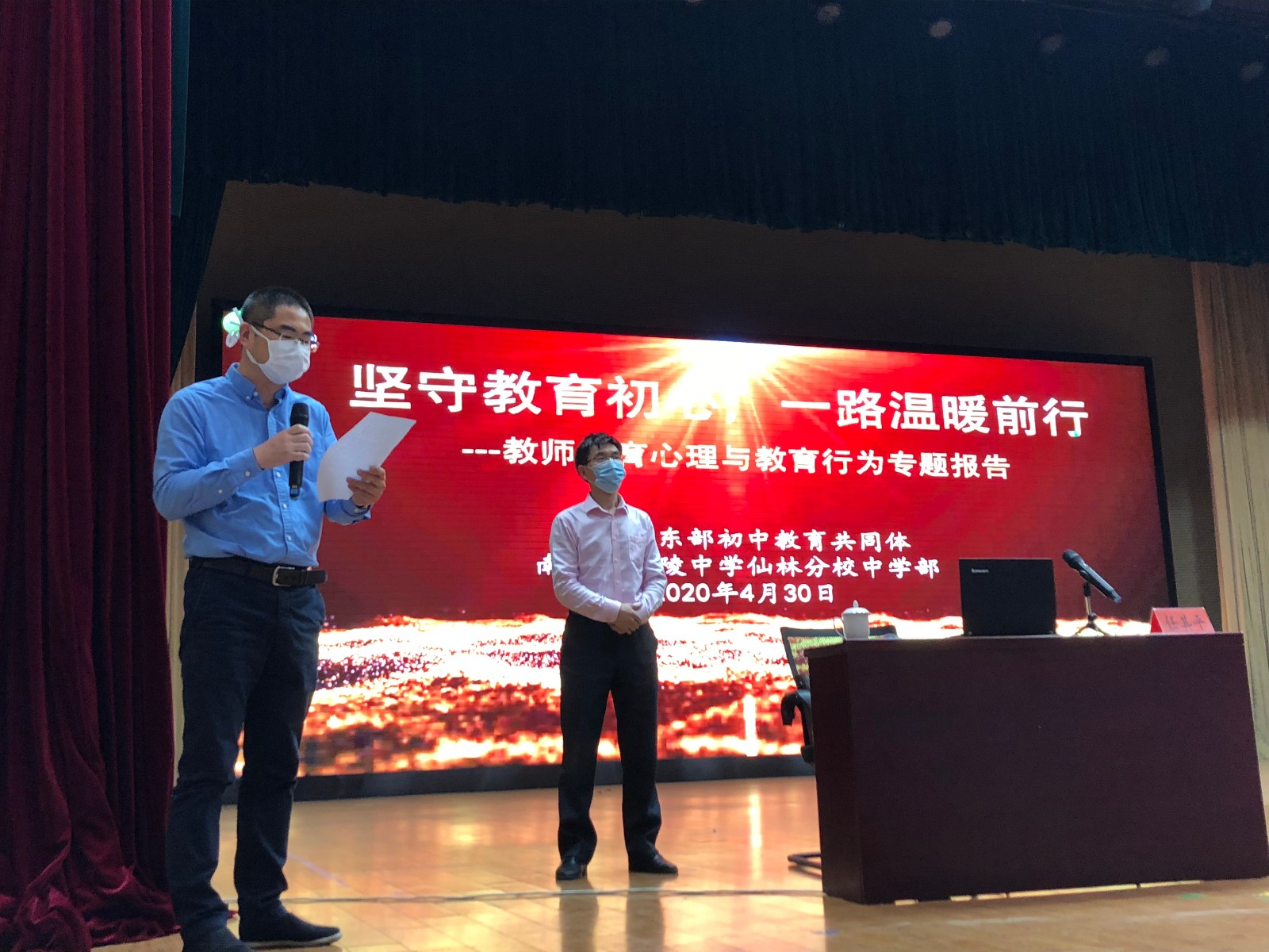 4月30日下午,我校邀请南京晓庄学院心理健康研究院院长、南京市中小学生心理援助中心主任、江苏省心理学会副理事长任其平教授来我校开设“新时代初中教师的心理健康与教育行为”专题讲座。翁德强校长主持讲座,我校全体教师及东部共同体学校的部分德育管理人员、班主任聆听了报告。