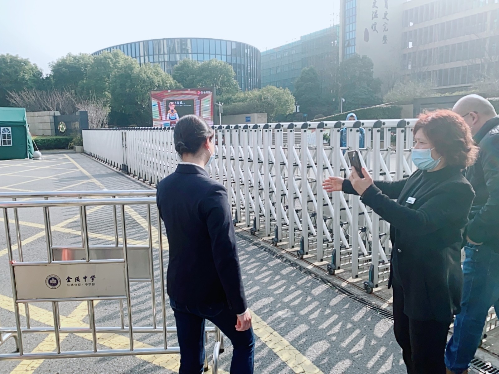 大门开启后,物业员工进入大门,无论开车、骑车、步行的,到门口必须接受保安测量体温,全程佩戴口罩。